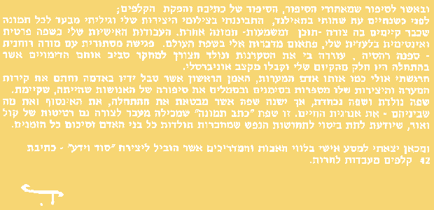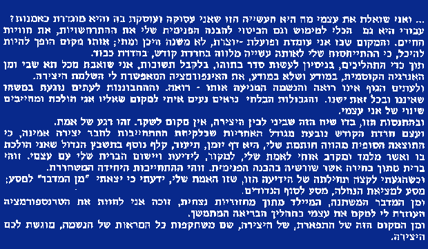 In this kind of experience, in this kind of dialogue between me and my creation, there is no place for a lie.This is a moment of truth. The essence of my holy attitude arises from the core of inner responsibility to create a reliable artwork, because the final result is my personal seal, my claendar, a commentary to the big puzzle, to the scroll I am walking on and which teaches me and takes me closer to my truth, to the origin, to knowing and applying this alliance with myself. This self-covenant was made out of free choice and goes back to the roots of my inner understanding. This is the only commitment that carries freedom. And when I reached the beginning of this acknowledgment, this knowing what my truth is, I knew I had come out "from the desert" to start the journey towards the legacy, the journey that brings an end to the wandering and shows the way. By the ever-changing desert and its eternal cycles I am blessed and have the privilege to express the transofrmations which help me locate myself in the continuous process of creation. And from the heart of my being, in the center of that creation where the reflections of all the souls are present, I am offering you my art. |